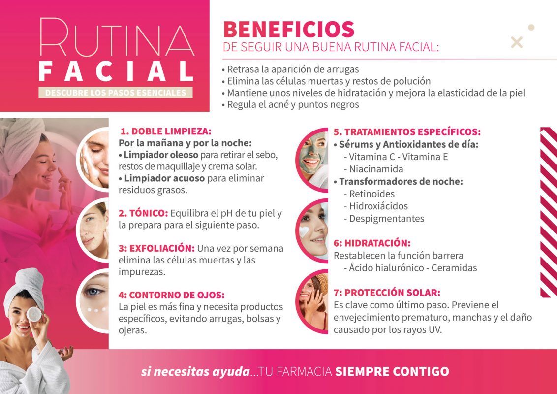 Descubre los beneficios de seguir una buena rutina facial 🥰🥰🥰 Te dejamos los pasos esenciales 🗒 Tu farmacia siempre contigo #cosmética #rutinafacial #limpiezafacial #contornodeojos #hidrataciónfacial #FOTOPROTECCIÓNSOLAR #ProtecciónSolar